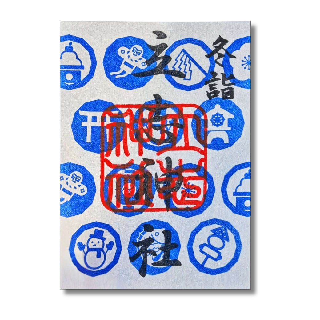 見た目もかわいらしい雪だるま、おでん、凧、梅など冬の季節を感じられるスタンプを押しています。
