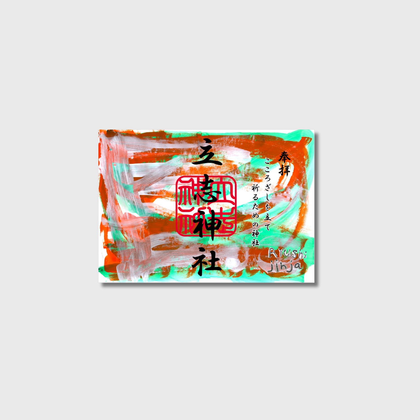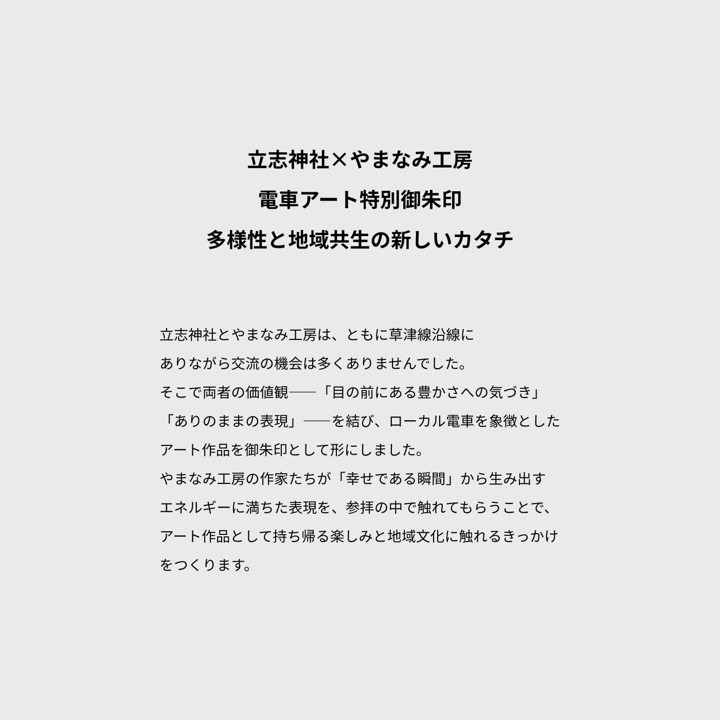 ⽴志神社とやまなみ⼯房は、ともに草津線沿線にありながら交流の機会は多くありませんでした。そこで両者の価値観――「⽬の前にある豊かさへの気づき」「ありのままの表現」――を結び、ローカル電⾞を象徴としたアート作品を御朱印として形にしました。